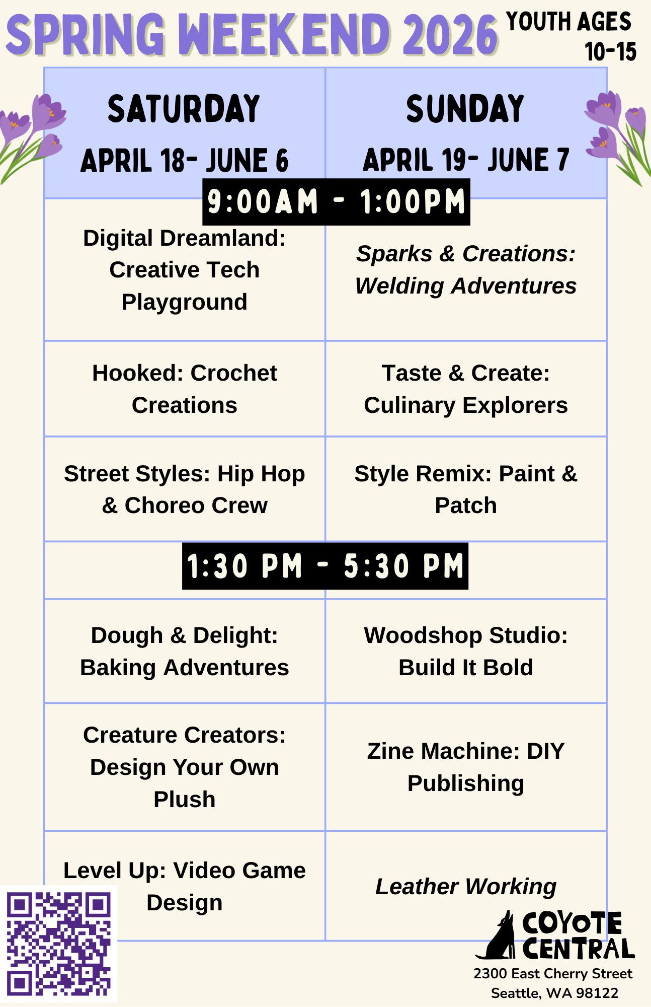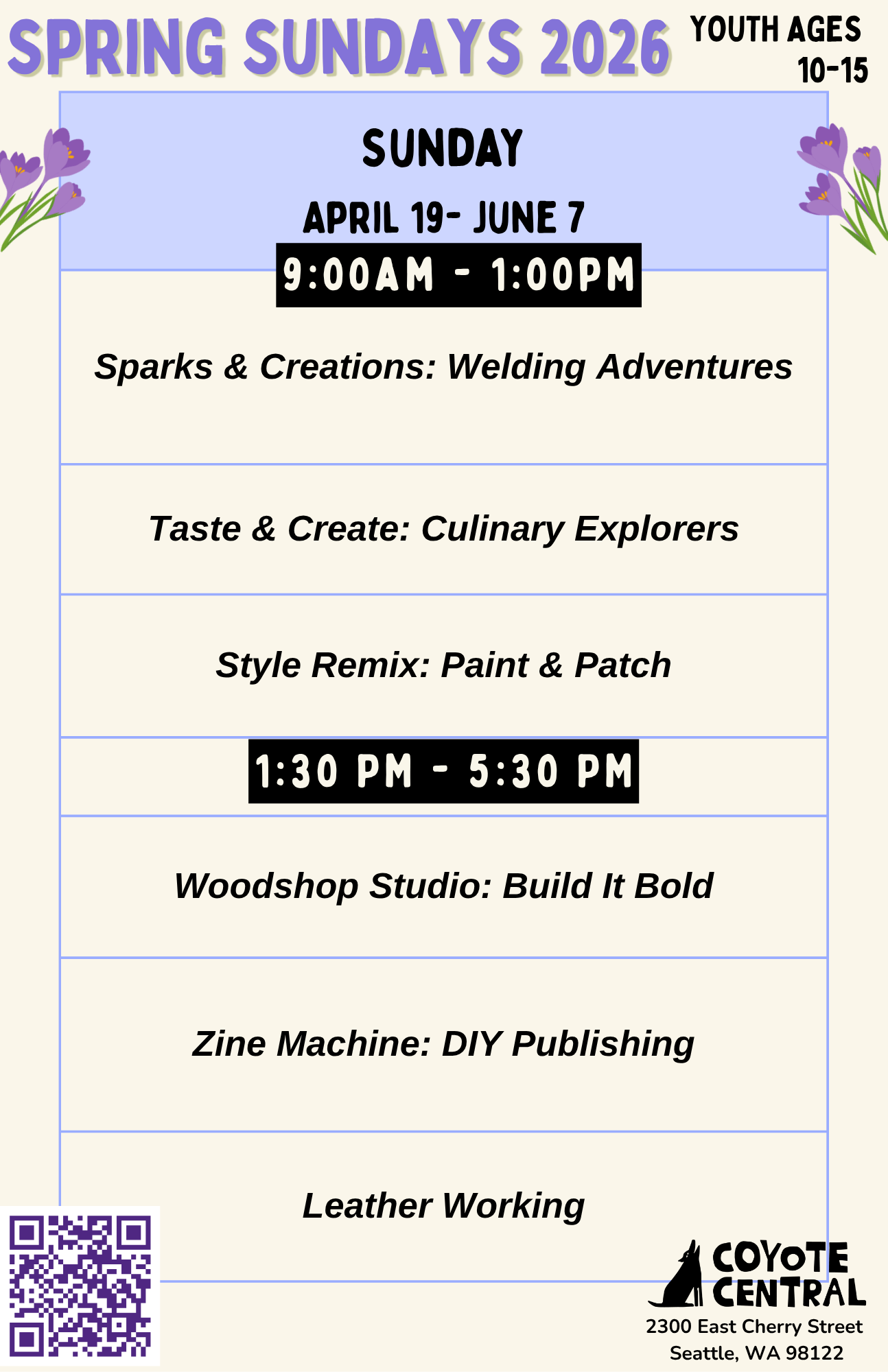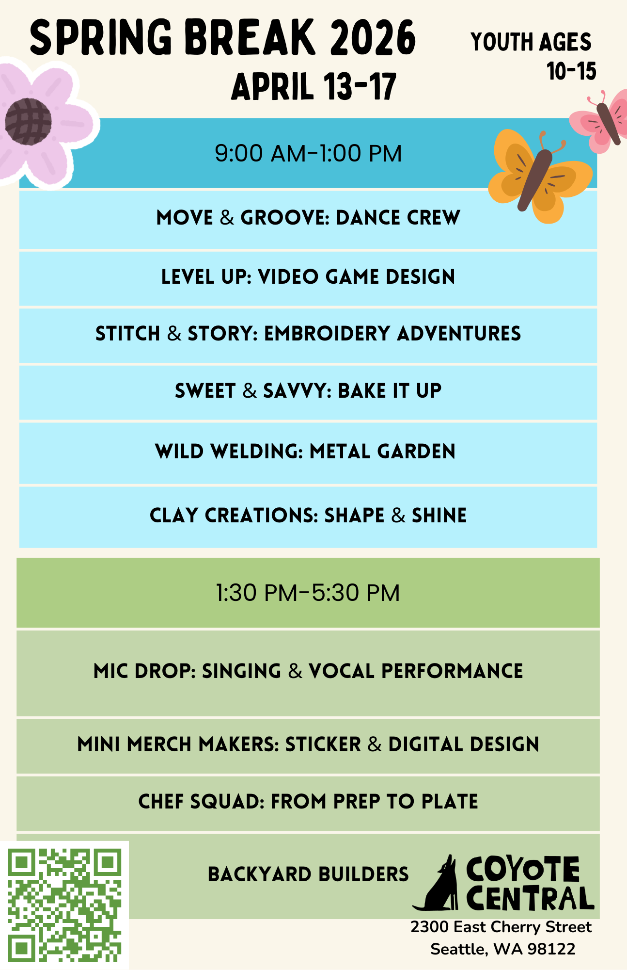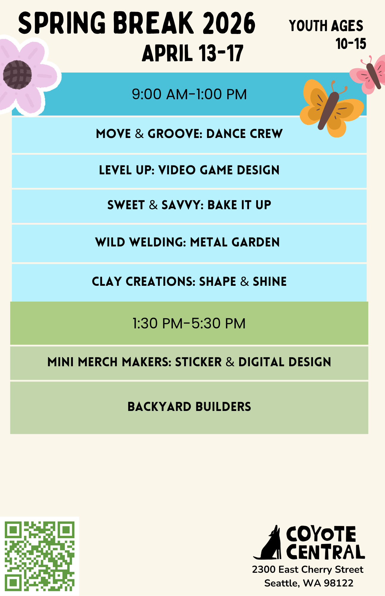 Coyote Central prides itself on being a space for youth ages 10-15 to learn new skills, build community, and take creative risks. In addition to supporting youth in their creativity journey, our work is also to ensure that youth and families, regardless of their financial situation, can participate in programming.
